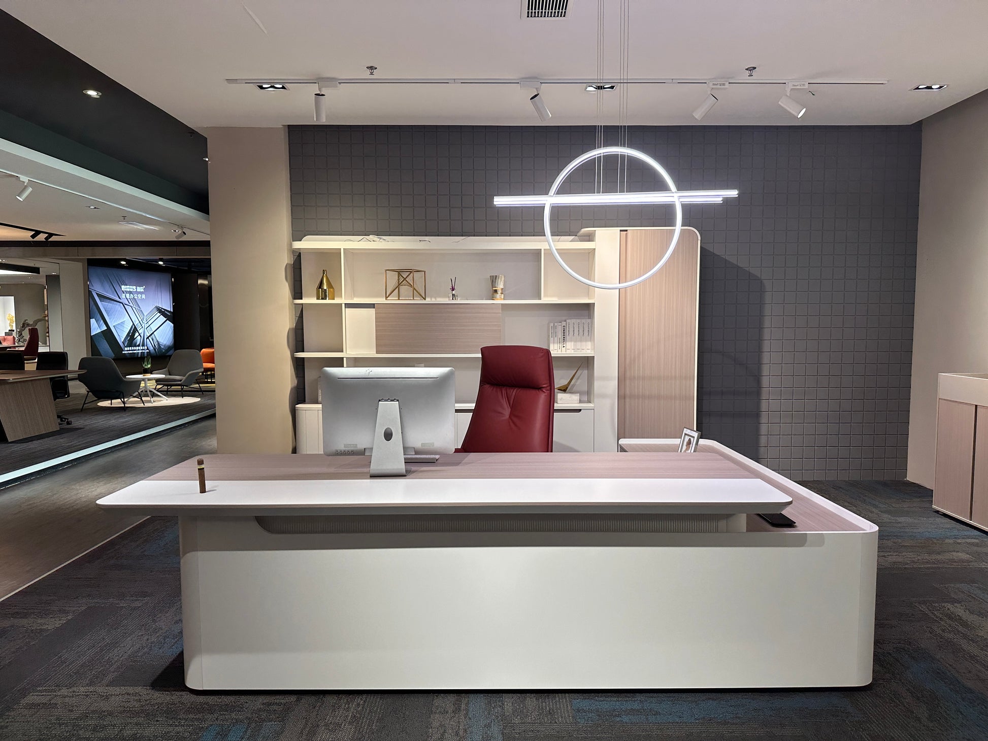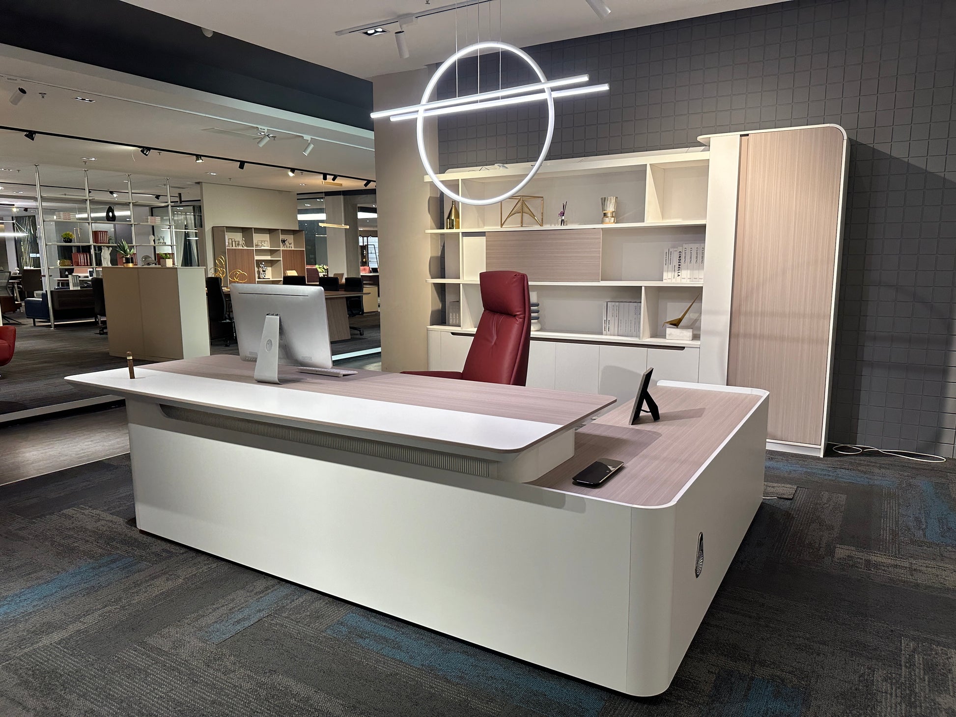 The Lunar Executive Desk is designed for modern professionals who value clean design, smart features, and a serene workspace. With its elegant Elm woodgrain and White finish, the Lunar range brings effortless sophistication to any executive setting.